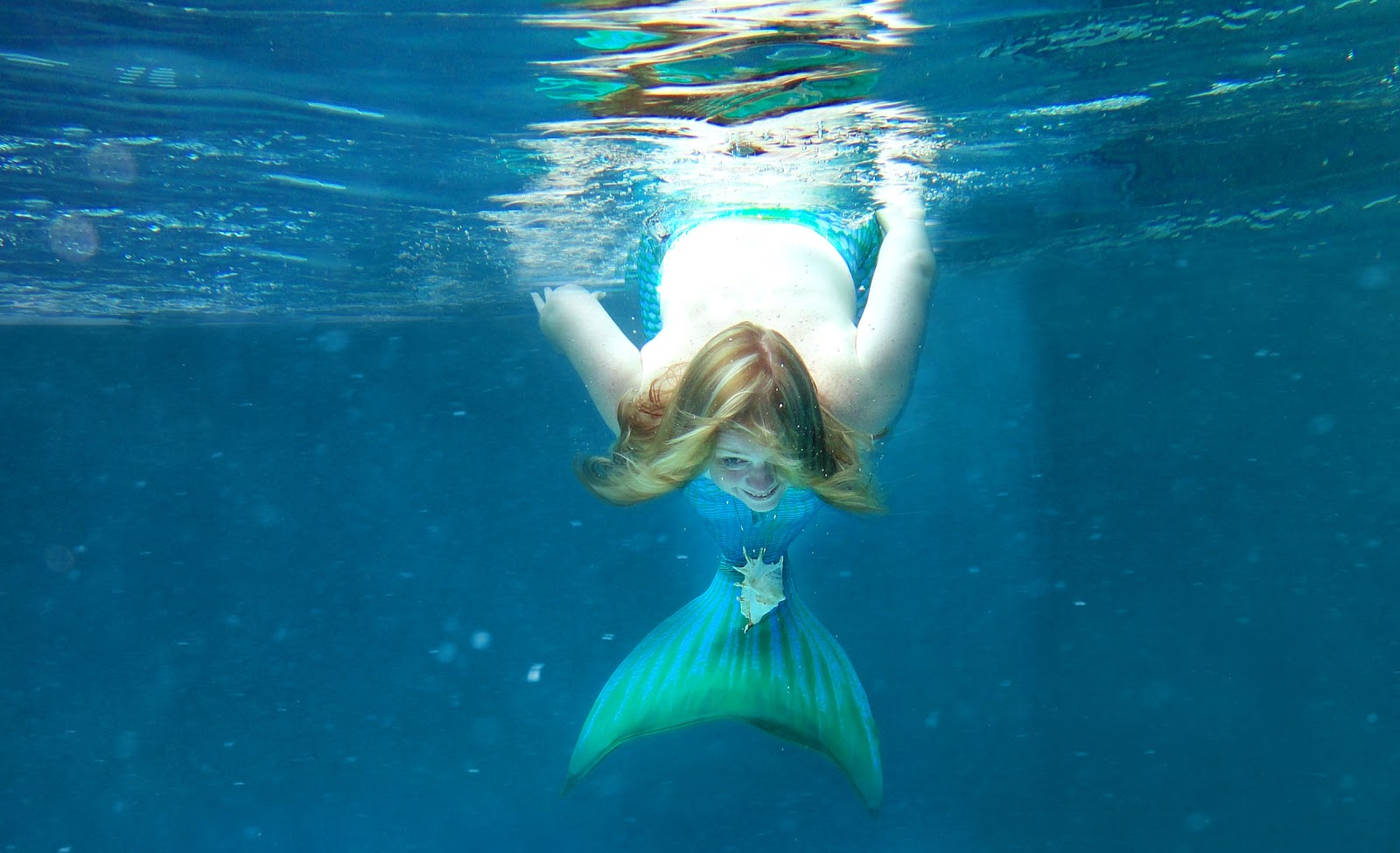 Im Juli fuhren wir in Urlaub, samt Flosse und Unterwasserkameragehäuse. Ich wollte doch erstmal ausprobieren, ob man mit der Flosse wirklich schwimmen kann. Nicht nur dass das super geht, es macht auch riesen Spass. Die nächste Frage, die sich ergab: Wo bitte, darf man mit solch einer Flosse ins Wasser. Wir durften in den Pool eines sehr grossen Kinderhotelkomplexes und wurden unter Gelächter begrüsst. Ein Mädchen fragte mich gar, ob ich eine "echte Meerjungfrau" sei. Einziger Nachteil war, dass der Pool sehr klein war. Auf einer der Touren fuhren wir an einem Freibad vorbei, sprachen mit der Pförtnerin und kamen am nächsten Tag mit allem Gepäck wieder. Da das Wetter sehr unbeständig war, hatten wir - oh grosser Zufall - ein grosses Schwimmbecken für fast 3 Stunden für uns alleine und konnten rumprobieren, wie wir wollten.